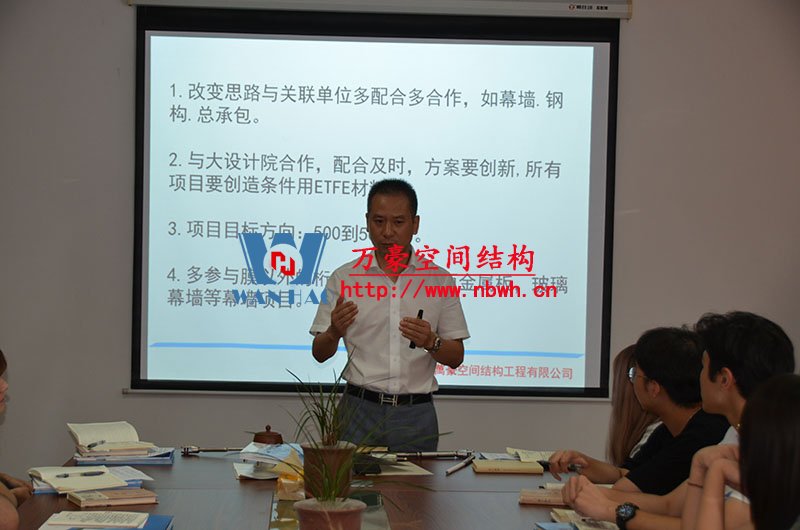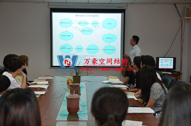 然后,我們的銷(xiāo)售主管教新員工們學(xué)習(xí)了公司晨會(huì)流程以及膜結(jié)構(gòu)建設(shè)工程項(xiàng)目流程。