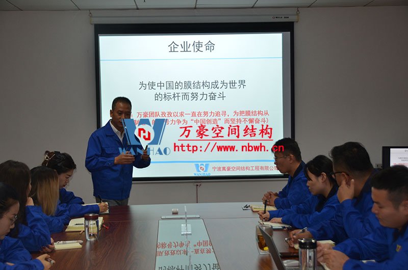 然后,我們的銷售主管教員工們學習了膜材料分類、膜結(jié)構(gòu)優(yōu)勢及應(yīng)用領(lǐng)域、膜結(jié)構(gòu)產(chǎn)品結(jié)構(gòu)形式等。
