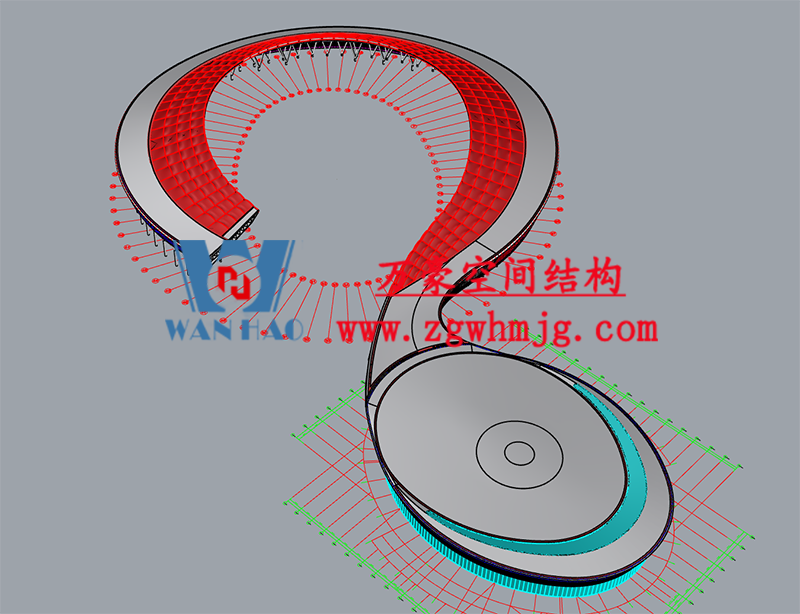 項(xiàng)目共有256跨懸挑,其中最大懸挑32m,最小懸挑4m。中間由向上托拱聯(lián)接而成,后面與鋁板交接,是常規(guī)類大型體育場館。