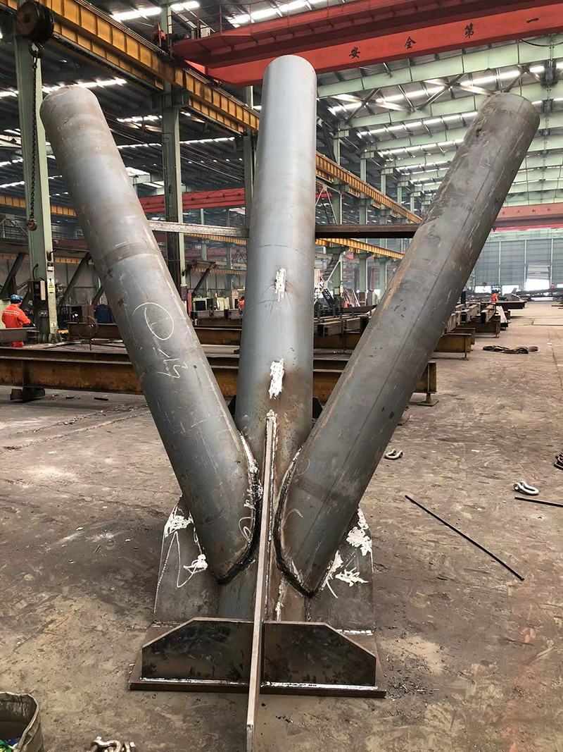該項(xiàng)目柱腳節(jié)點(diǎn)復(fù)雜,為避免應(yīng)力集中,確保結(jié)構(gòu)安全,柱腳三根桿件在工廠組焊成整體進(jìn)行吊裝,然后和現(xiàn)場拼接桿件對接。