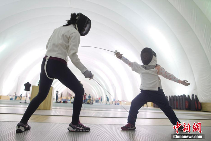 12月1日,一位學(xué)生在北京市某學(xué)校充氣膜體育館學(xué)習(xí)擊劍。11月29日空氣重污染橙色預(yù)警;11月30日霾橙色預(yù)警;12月1日大霧橙色預(yù)警。北京史上首次三個預(yù)警全“橙”發(fā)送。截至昨日,今年最嚴(yán)重空氣污染過程已持續(xù)了5天。昨夜,冷空氣抵達北京,霧霾逐漸消散。今起至4日,京城空氣優(yōu)良。昨日24時,市空氣重污染應(yīng)急指揮部解除北京空氣重污染橙色預(yù)警。 (來自:中國新聞網(wǎng))