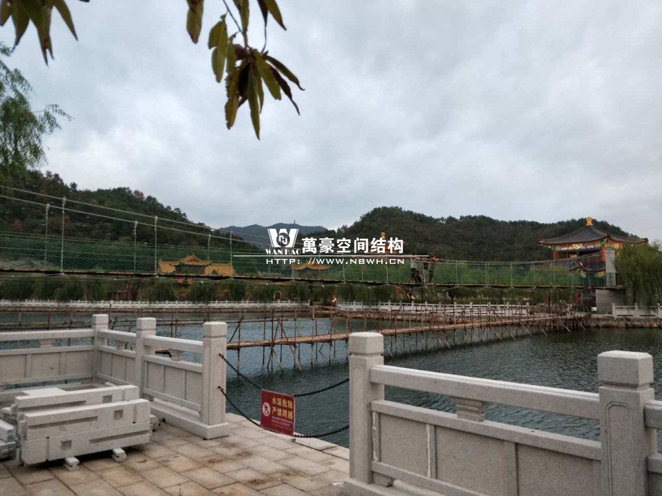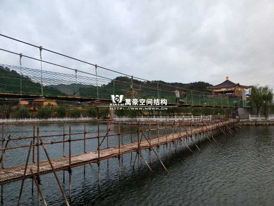 該橋采用8根柔性鋼絲繩,4支立柱作為受力構(gòu)件,橋面采用組合型鋼作為支撐面,上鋪防腐木枋板。根據(jù)橋面與水位的相對高程,吊橋主跨為65m。該橋橋面凈寬度為1.5m,吊橋橋面總寬度2.0m。上鋪4公分厚的防腐木枋板。最多可承受130人行走,橋下能自由通行龍船。符合景區(qū)游客娛樂性游玩與功能性通行的完美結(jié)合在一起。