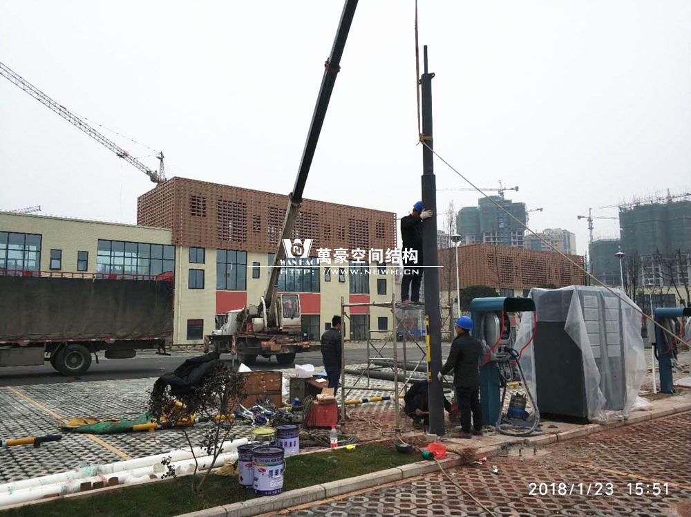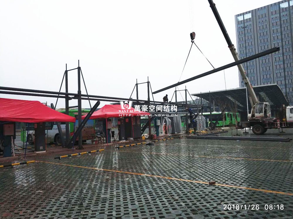 而本工程位于岳池火車站的對面的客運(yùn)中心,是比亞迪公交車充電樁的附屬設(shè)施。工程總用鋼量達(dá)8噸,膜材面積400平方米,以雙挑的形式為現(xiàn)場的充電樁遮陽擋雨。