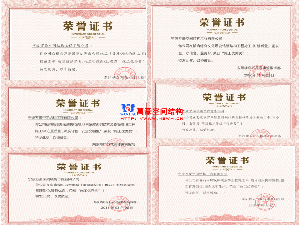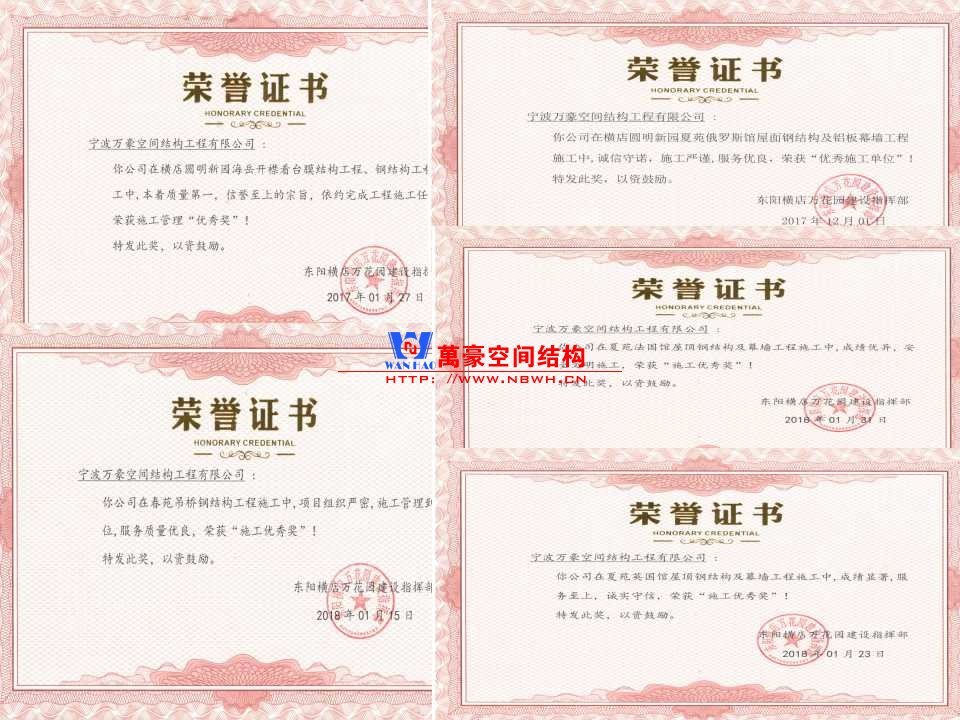 大家還記得萬(wàn)豪在橫店做的一系列膜結(jié)構(gòu)工程嗎?所有的工程,全部獲得了業(yè)主的高度評(píng)價(jià),全都獲得了榮譽(yù)證書。這就是實(shí)力的證明,這就是技術(shù)的展現(xiàn)。