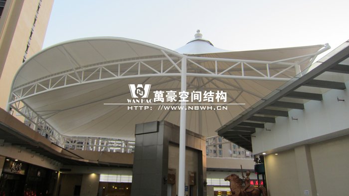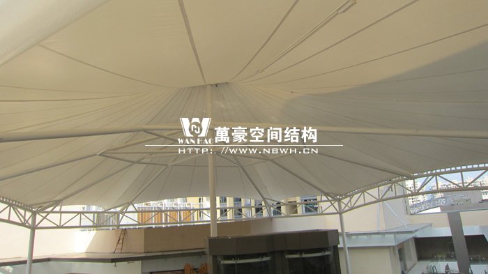本工程總建筑面積約900平方米,主體一根主柱、九根支柱,四周單片桁架連接,總體一個帽柱,直線長為26.9米,帽柱總高33.6米,寬為27.8米。因為本工程坐落在商業(yè)區(qū)中心,四周都是五層商鋪,吊車無法進入施工現(xiàn)場,先用25噸吊車把材料送到五層樓房頂,后用人工或手拉葫蘆進行運送和安裝。施工范圍包括鋼結(jié)構(gòu)系統(tǒng)與膜材系統(tǒng)的制作和現(xiàn)場安裝施工,現(xiàn)工程已經(jīng)完工。