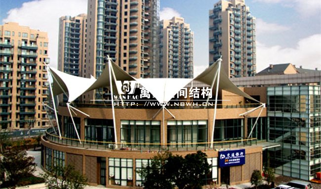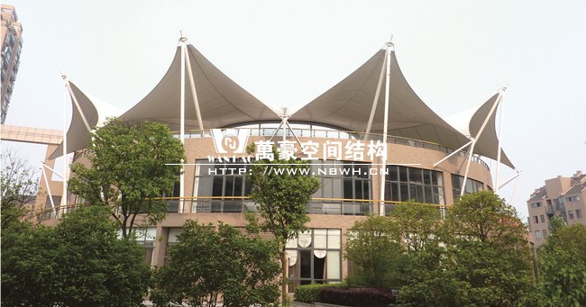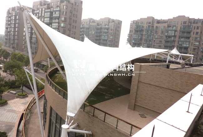 工程屹立在寧波鄞州區(qū)紫郡小區(qū),作為小區(qū)售樓處屋頂景觀,整體工程有8片單體膜組成,每片單體膜展開面積約50平方米,結構造型飄逸輕盈,結構受力有墻體承載,為張拉式膜建筑的典型代表,膜材高低起伏,形如波濤拍岸。極具現(xiàn)代化氣息,和諧的融與環(huán)境,成為商業(yè)小區(qū)的一道亮麗風景線。