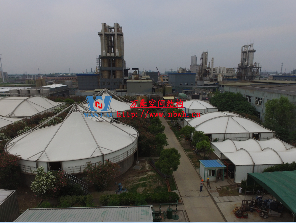 東廠區(qū)生化池膜結(jié)構(gòu)加蓋工程,坐落于浙江省紹興市杭州灣上虞經(jīng)濟(jì)開發(fā)區(qū)龍盛科技園內(nèi)。整個項(xiàng)目由A/O池加蓋4座、二沉池加固定蓋4座、濃縮池加蓋2座、氧化池加蓋1座、氧化氣浮池加蓋1座、氧化集水池加蓋1座、出水調(diào)節(jié)池1座、安諾池1座,共計(jì)15座鋼膜結(jié)構(gòu)組成??傆娩摿窟_(dá)350噸,膜結(jié)構(gòu)展開面積達(dá)35000平方米。